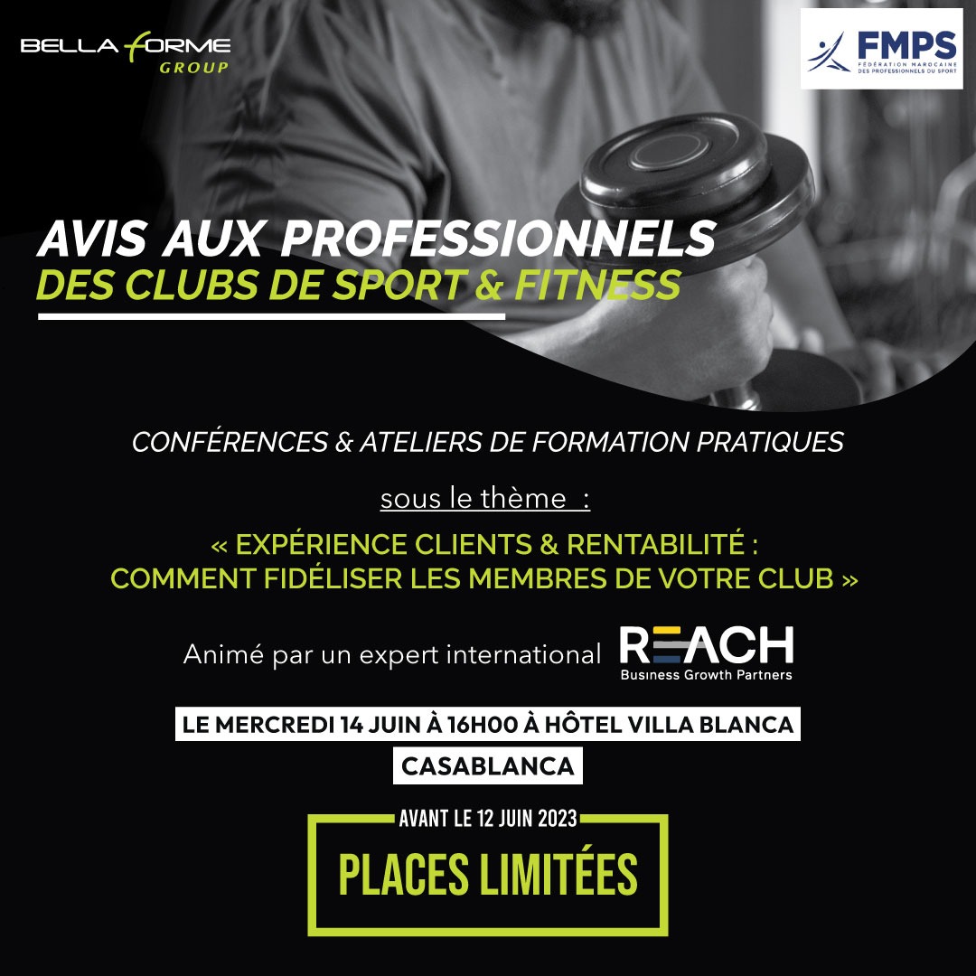 La Fédération Marocaine des Professionnels du Sport a organisé mercredi 14 juin 2023 à Casablanca en partenariat avec Bella Forme Sport & Fitness – Equipements & Service un atelier de formation animé par un expert international REACH (Business Growth Partners) en présence d’une cinquantaine de professionnels des clubs de sport et de fitness.